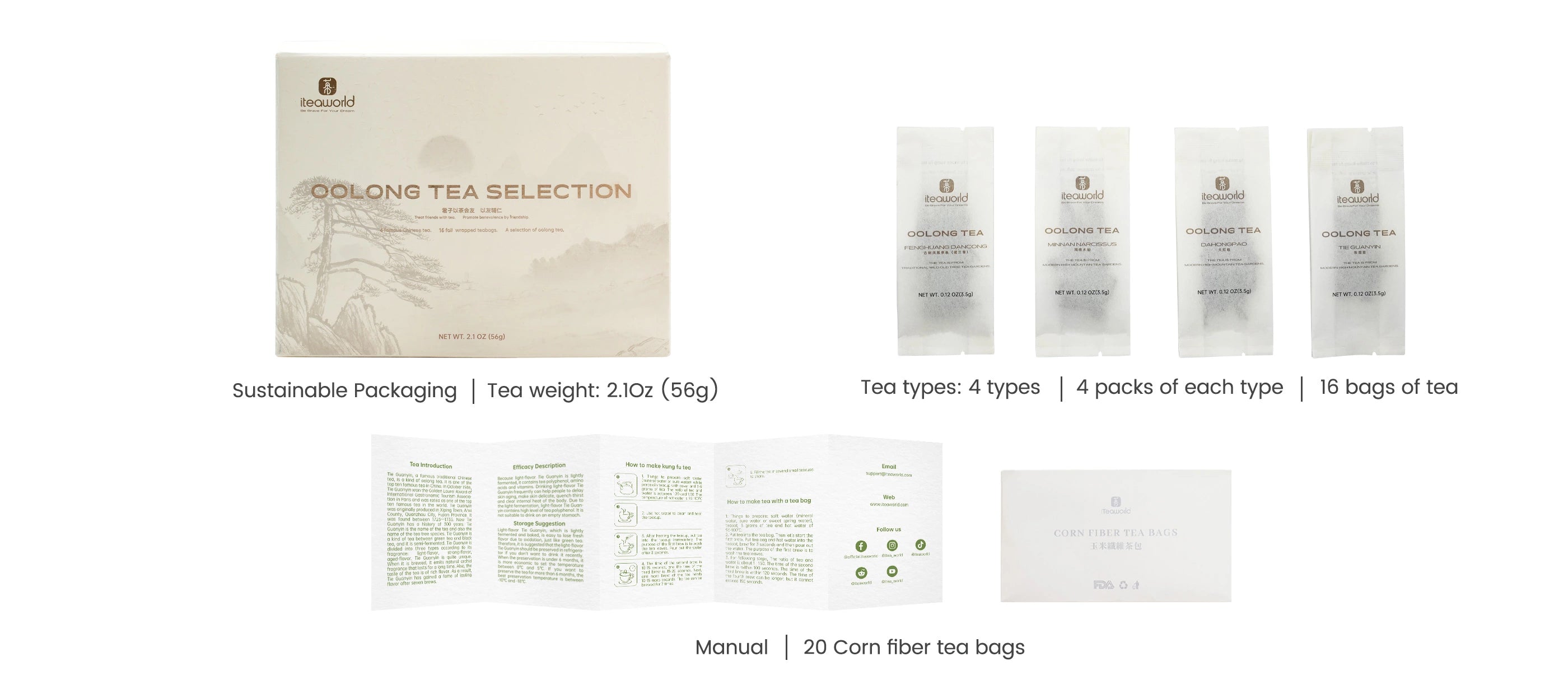 The Oolong Tea Sampler comprises four renowned loose-leaf Oolong teas from China: Tie Guan Yin, Minnan Narcissus, Da Hong Pao, and Feng Huang Dan Cong. It provides a comprehensive opportunity to appreciate the disparities among Oolong teas, from their refreshing, floral, honeyed, to fruity aromas. Moreover, you'll delve into the variations in taste brought about by differences in fermentation levels and roasting intensities. Additionally, you'll explore the unique flavors derived from both modern high-mountain tea gardens and ancient tree plantations. This sampler simplifies the process of identifying your preferred Oolong tea variety.