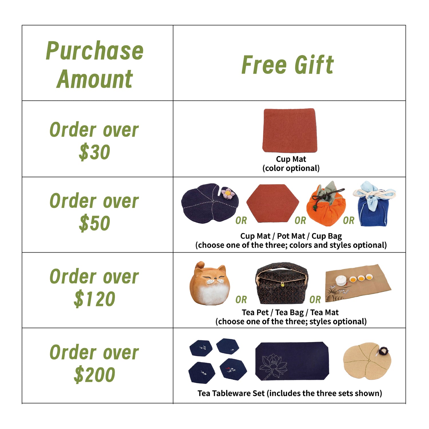 - Spend $200 → Get a free tea mat set
