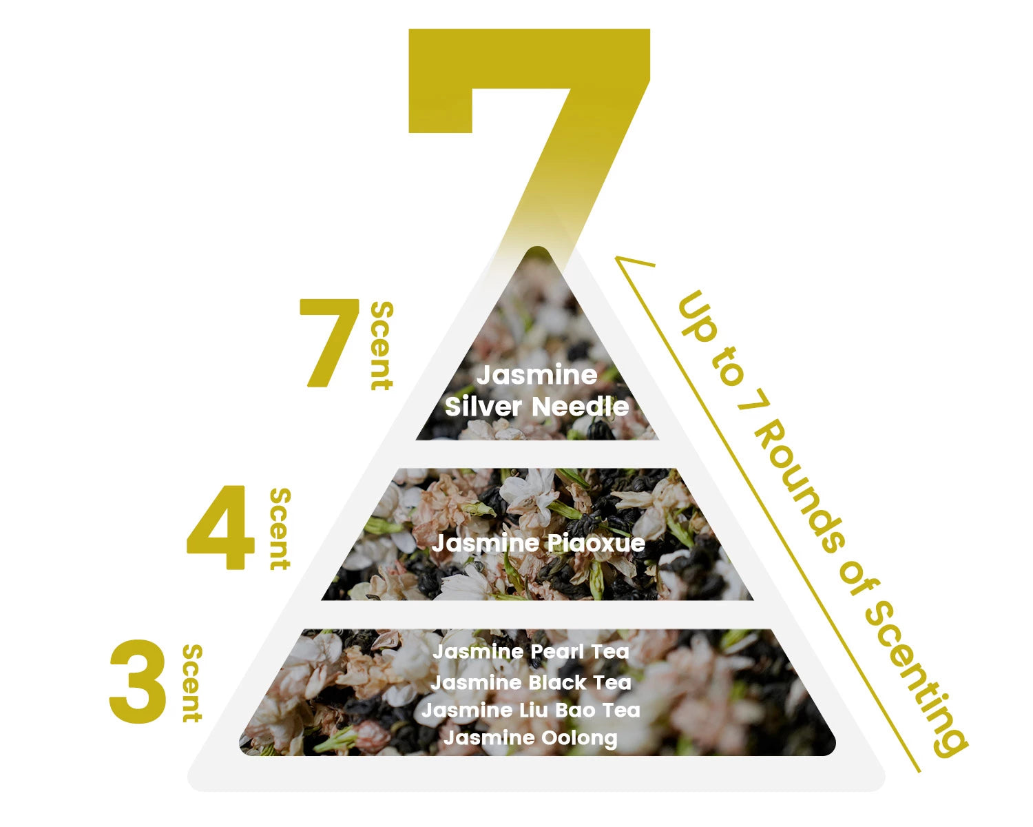 We carefully select five premium tea bases—white tea, green tea, Tie Guan Yin oolong, Liu Bao dark tea, and black tea—to craft six distinct jasmine teas: