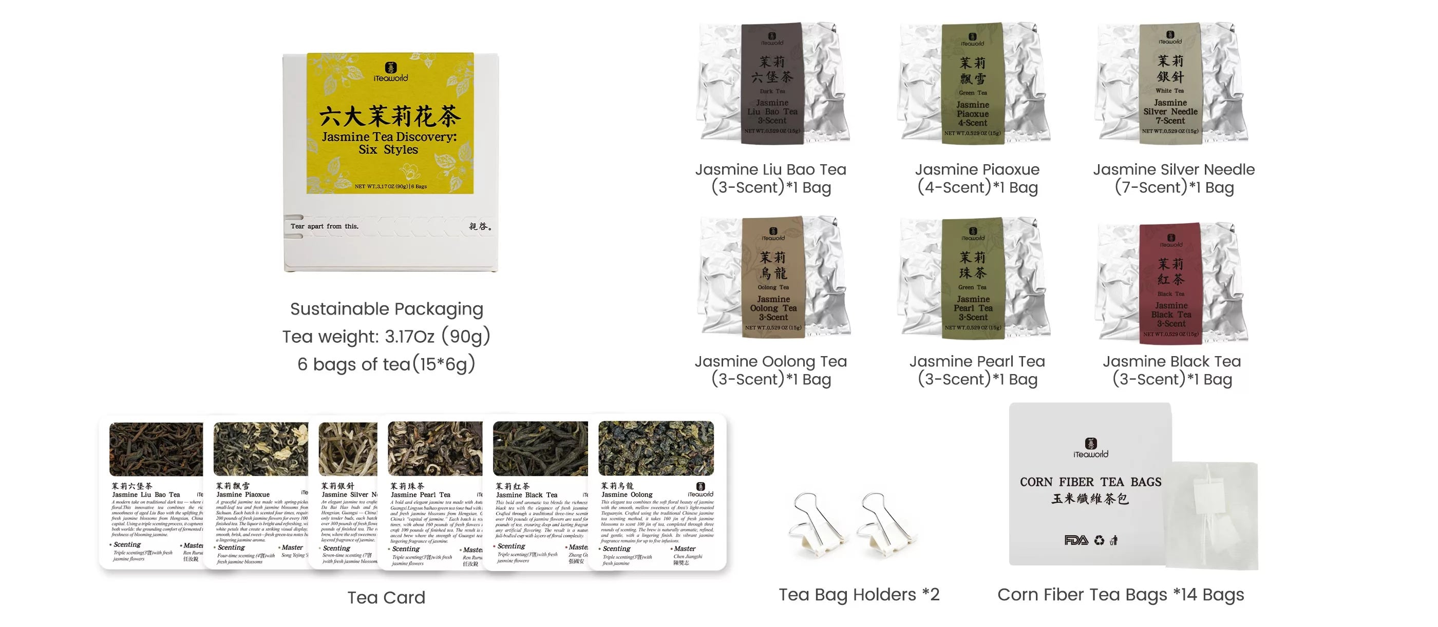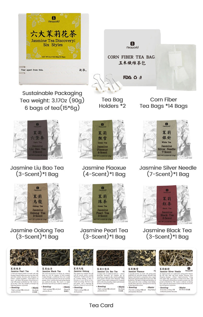 All tea bases are 2025 harvests (except Liu Bao, which was harvested in 2023 and aged for two years), scented in 2025 with fragrant jasmine flowers from Hengxian, Guangxi. Each 15g pack is individually vacuum-sealed in an aluminum bag to lock in aroma, preserving the original freshness of both tea leaves and jasmine. Every brew delivers a truly fresh and fragrant cup.