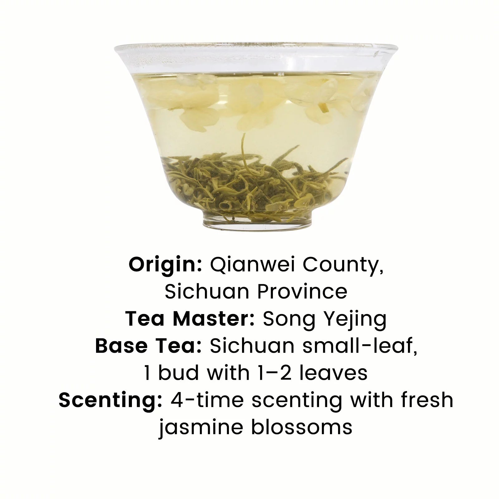 Adhering to traditional jasmine scenting craftsmanship, with no added flavors or chemicals, this tea strictly follows the “morning pick, evening scent” process — plump jasmine buds are harvested during the day and scented with tea leaves that evening. As the jasmine blooms overnight, the tea and flowers are layered and left to rest, allowing the fragrance to deeply infuse the leaves. With 3 rounds of scenting, the tea-to-flower ratio reaches 1:1.6, meaning a 5g cup contains the essence of approximately 23 fresh jasmine blossoms. A true “drinkable perfume” in every cup.