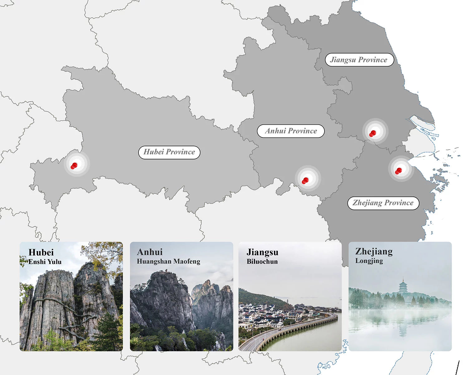 Four of the most important green tea regions in China — each representing a different landscape, climate, and expression of spring.