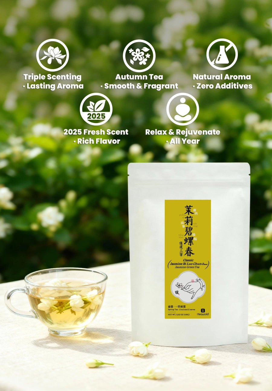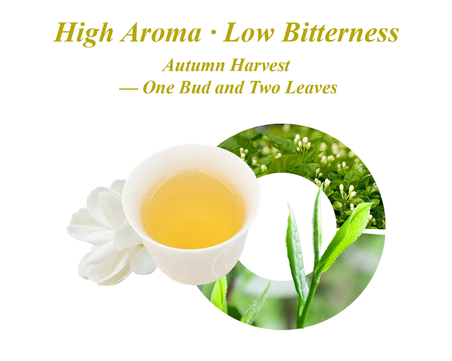 Made from Lingyun Baihao autumn green tea (one bud and two leaves), grown slowly under large day-night temperature differences. Compared with summer teas commonly used in jasmine tea, autumn tea has lower polyphenols and higher aromatic compounds, making it less bitter, more smoothly sweet, and perfectly complementing the fresh and lively jasmine fragrance.