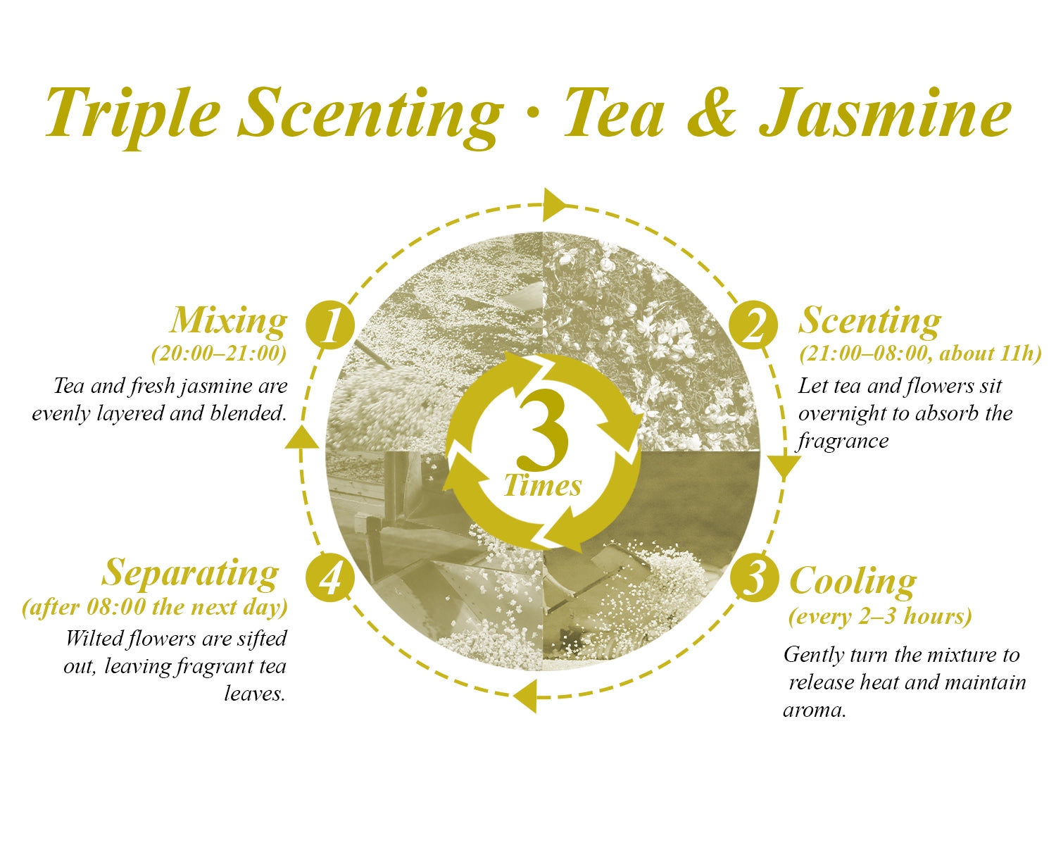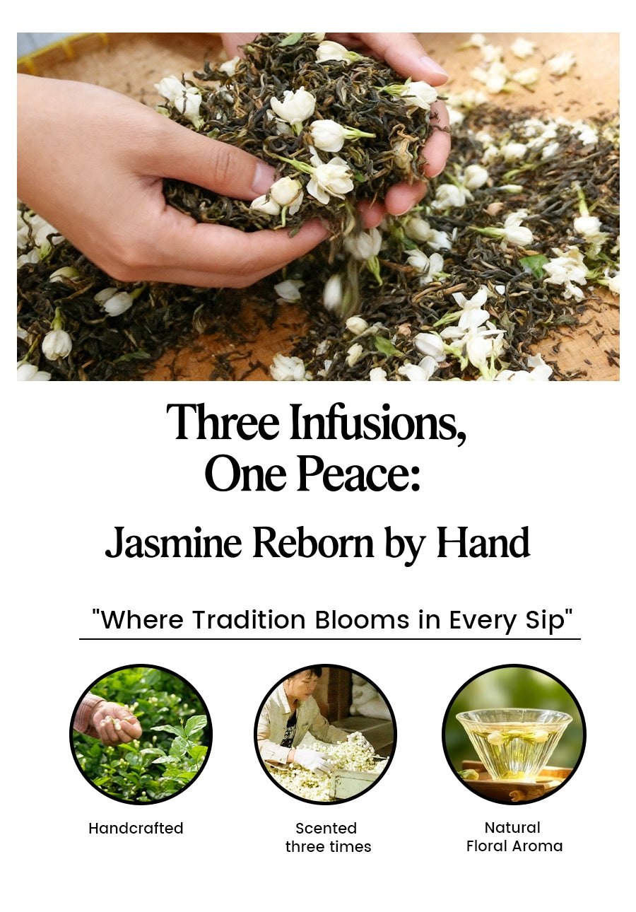 Following the ancient triple-scenting method, this tea is crafted over 3–5 days. Each scenting stage involves careful manual mixing, allowing jasmine flowers and tea leaves to fully interact. Repeated three times, the process layers the aroma, producing a delicate and long-lasting floral scent. Every step is meticulous, with no shortcuts, preserving the natural fragrance and true character of the tea.