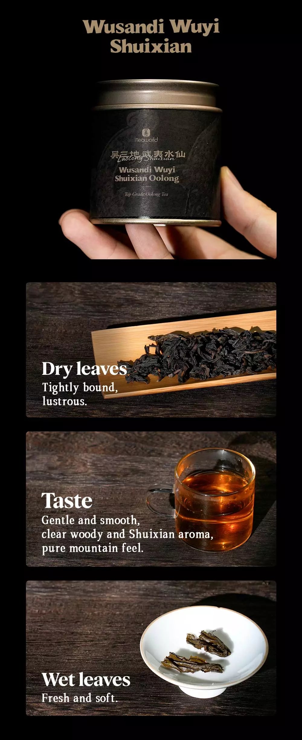 Region: Wusandi, Wuyi Mountains — high mountain gorge, 700–1200m altitude. 70-year-old Shuixian bushes, pure mountain flavor, thick texture, resilient to multiple infusions.