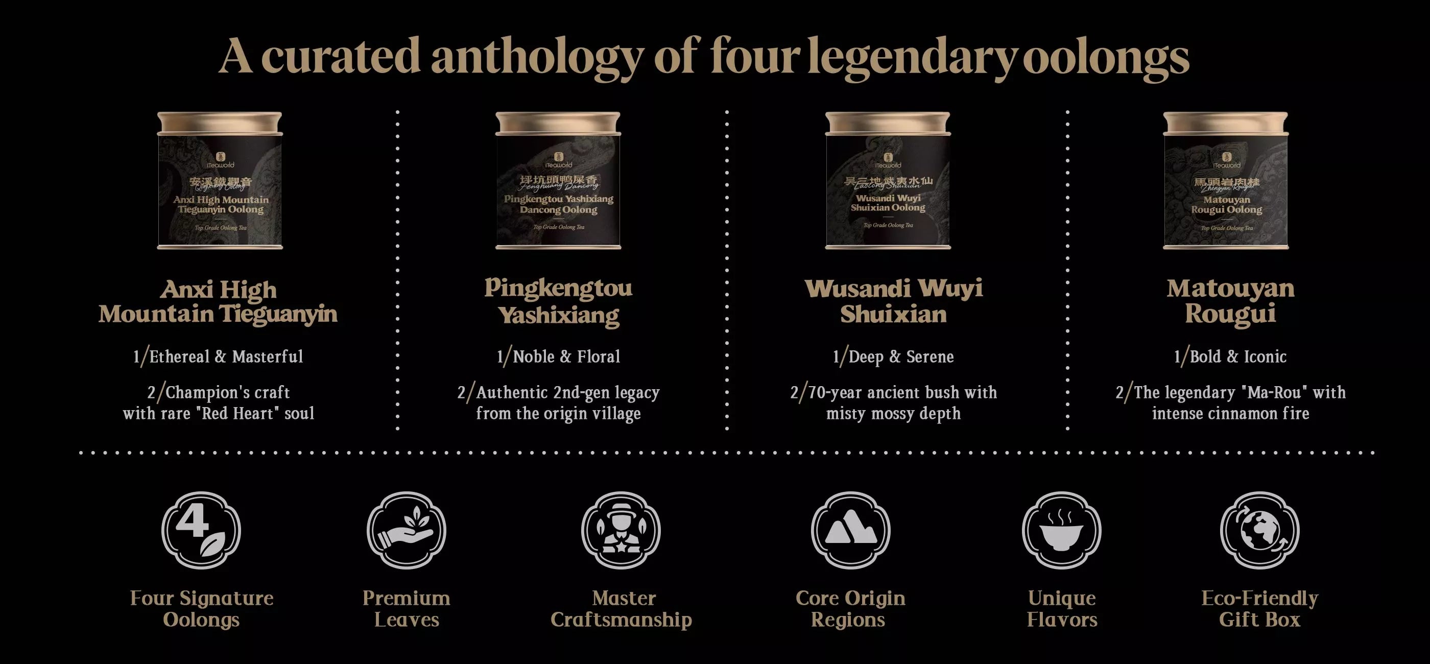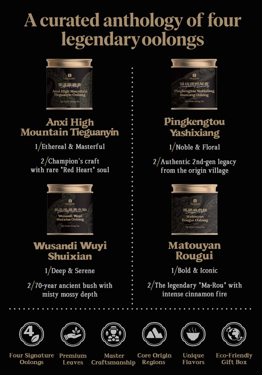 The Masterpiece Oolong Collection brings together four top-tier oolongs, each carefully selected by skilled tea masters from their core regions, perfectly embodying the timeless art of oolong tea.