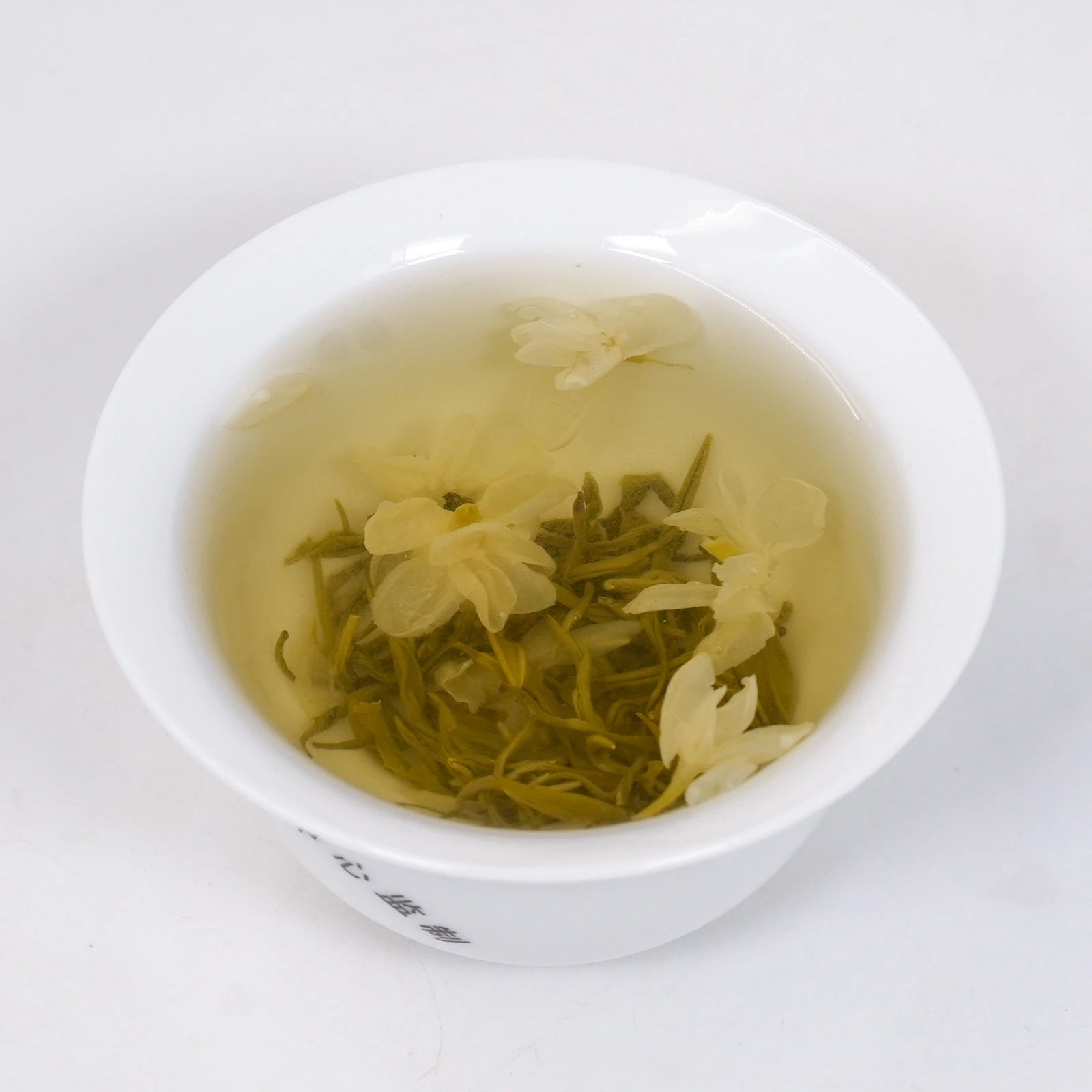 A graceful jasmine tea made with spring-picked Sichuan small-leaf tea (one bud with one to two leaves) and fresh jasmine blossoms from Jianwei, Sichuan. Each batch is scented four times, requiring nearly 200 pounds of fresh jasmine flowers for every 100 pounds of finished tea. The liquor is bright and refreshing, with floating white petals that create a striking visual display. Flavor is smooth, brisk, and sweet—fresh green-tea notes balanced by a lingering jasmine aroma.