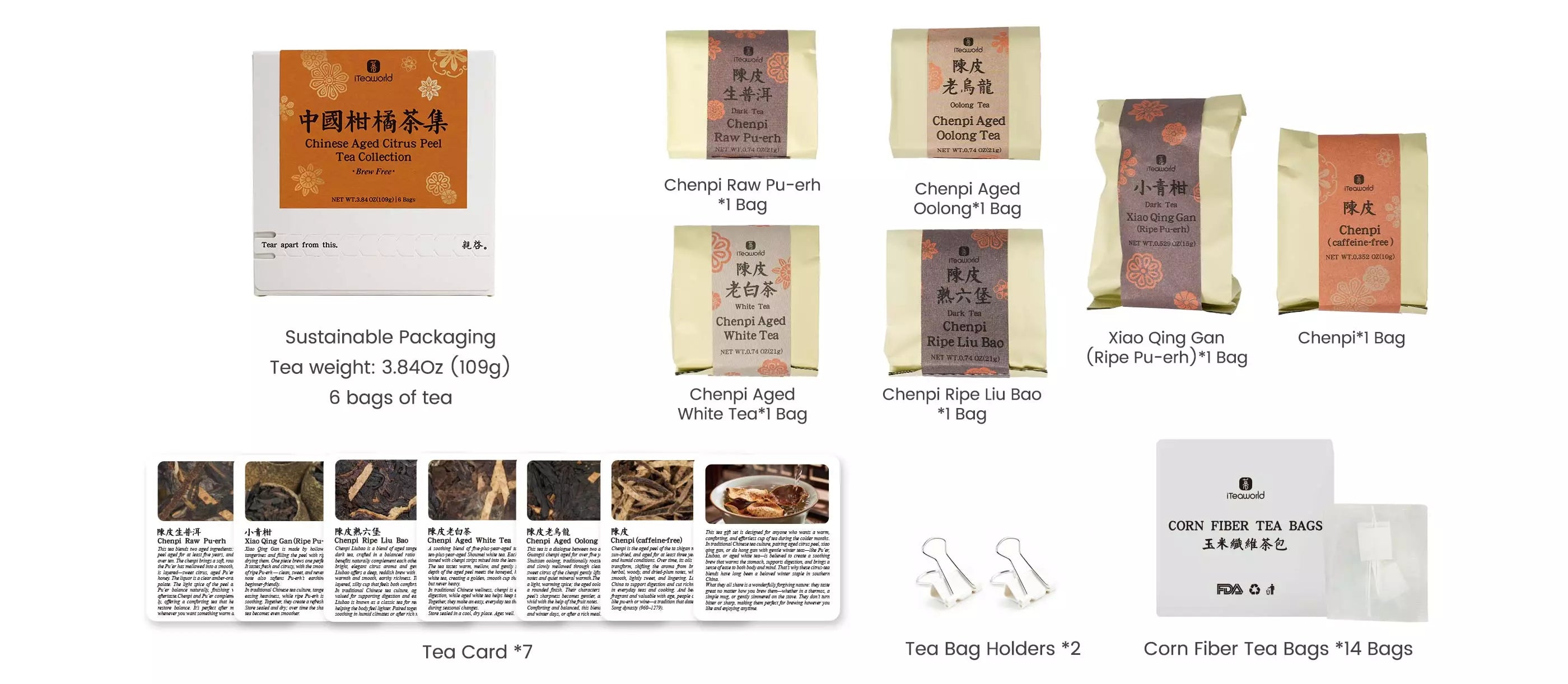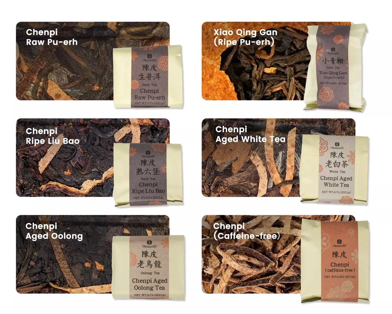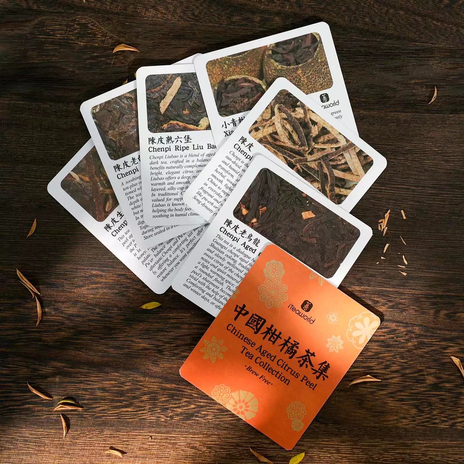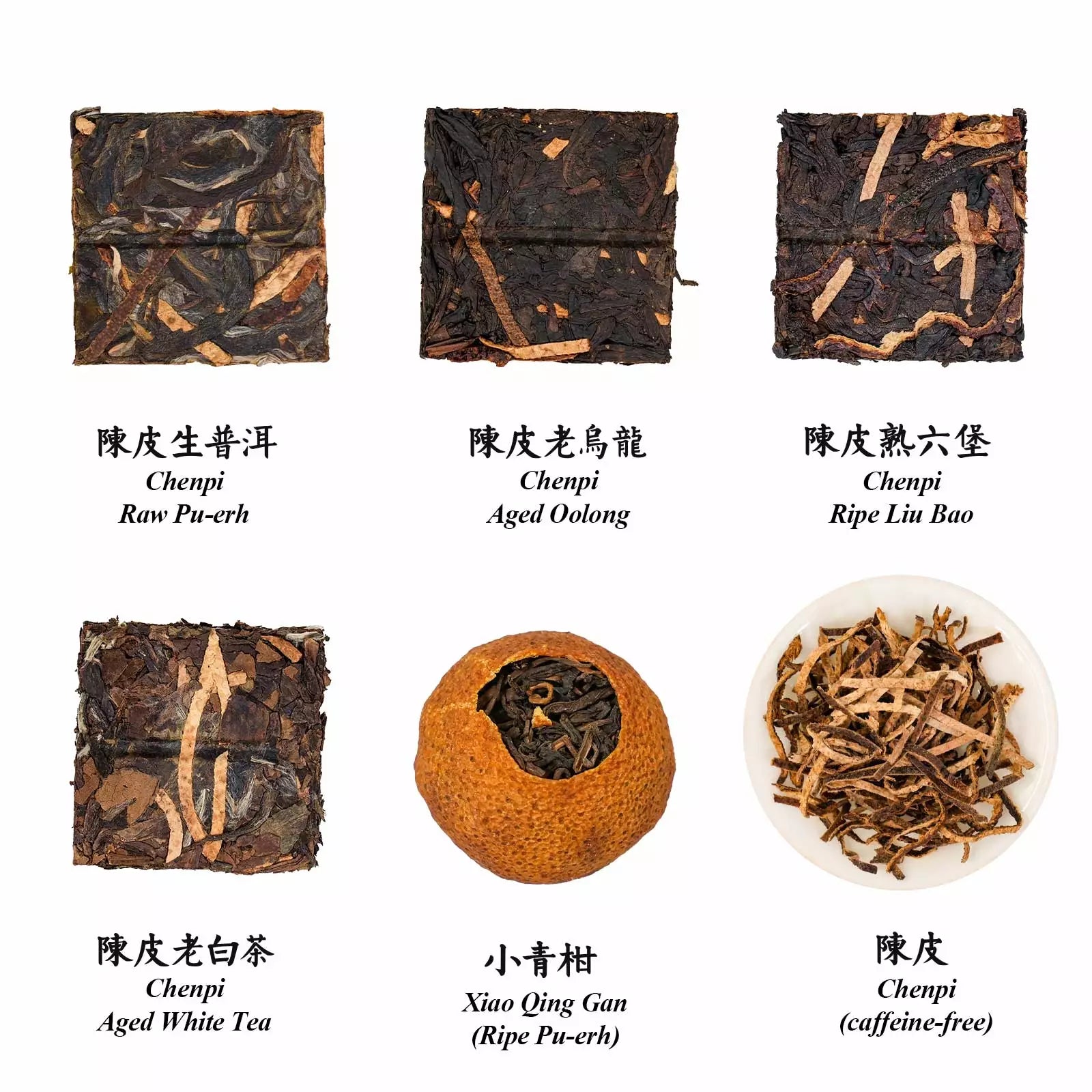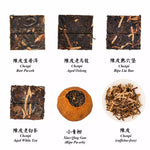 5 carefully selected Aged Mandarin Peel & Tea blends: Raw Pu-erh, Mini Green Mandarin (Ripe Pu-erh), Liu Bao, Aged White Tea, and Aged Oolong