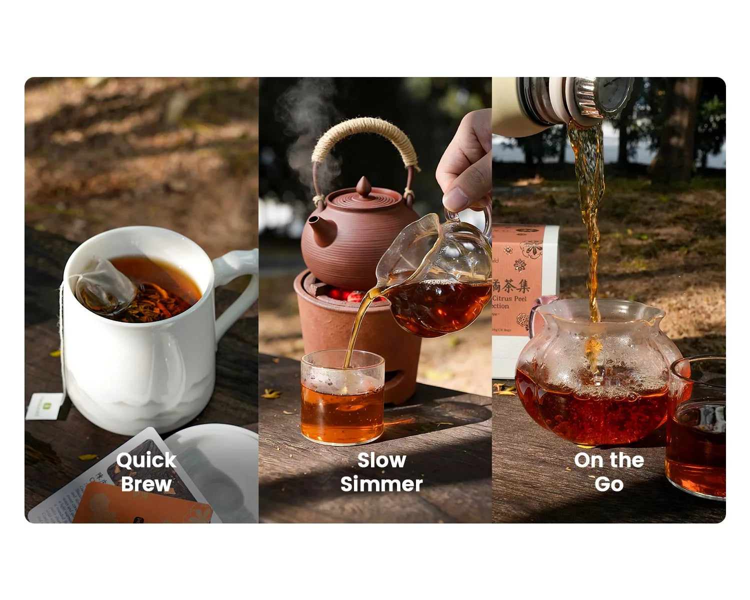 Gentle all day: The tea are low in caffeine, and the mandarin peel contains none. Enjoy the tea during the day, and sip pure mandarin peel in the evening — a soothing, caffeine-free ritual from day to night.