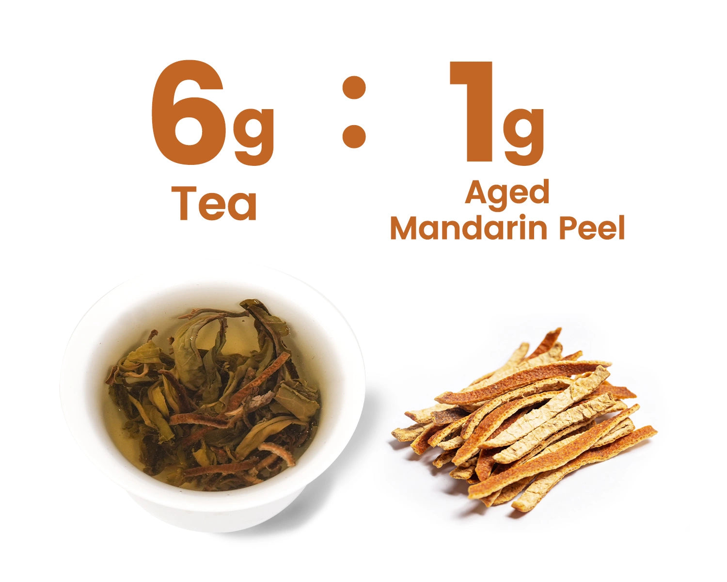 1 g Aged Mandarin Peel and 6 g tea — the perfect ratio from multiple trials. Creates a smooth, naturally sweet, and soothing cup. Contains mild caffeine without jitters, ideal for moments of calm.