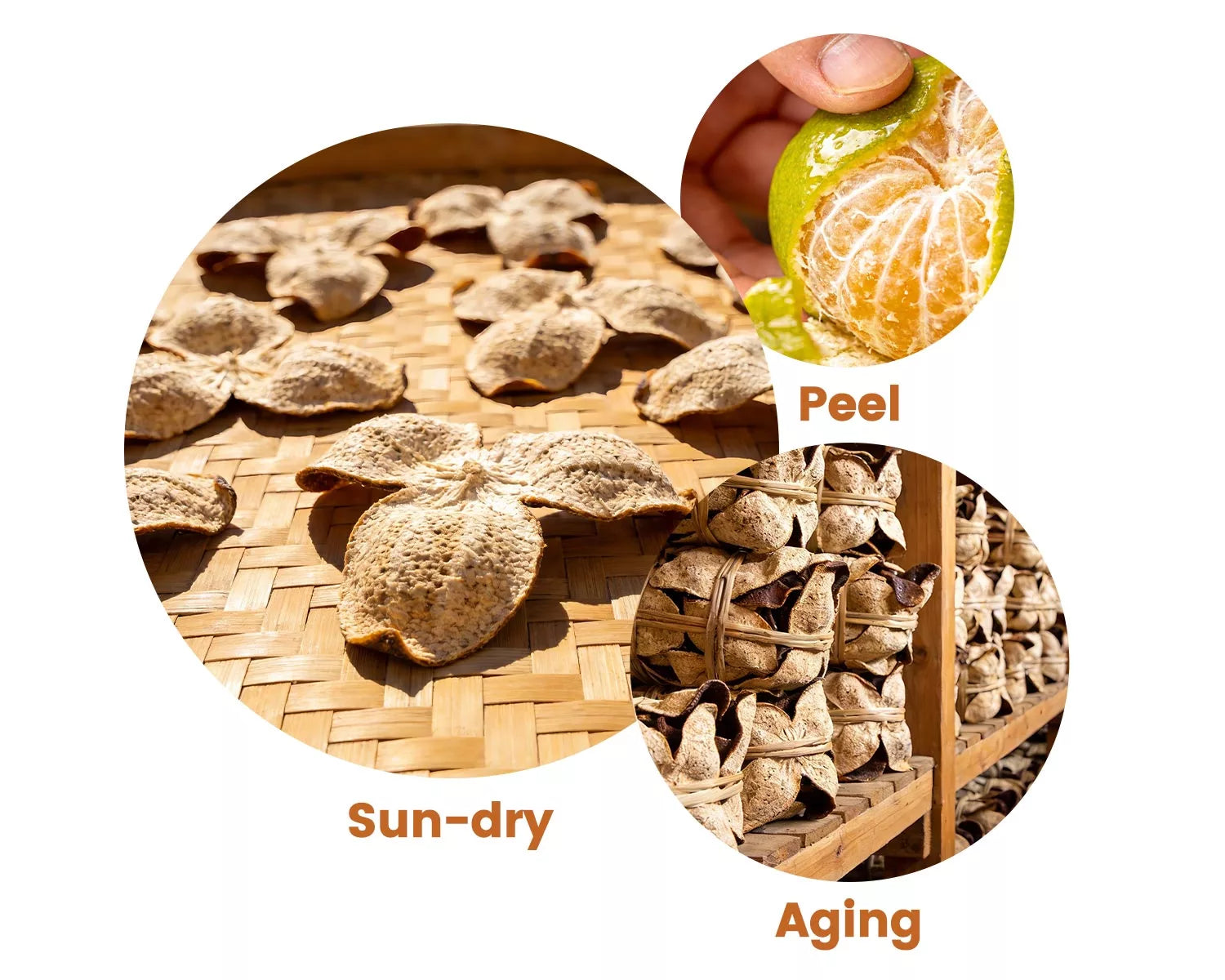 Only the peel is kept, naturally sun-dried and aged for over three years to become what the Chinese call Chenpi (Aged Mandarin Peel).