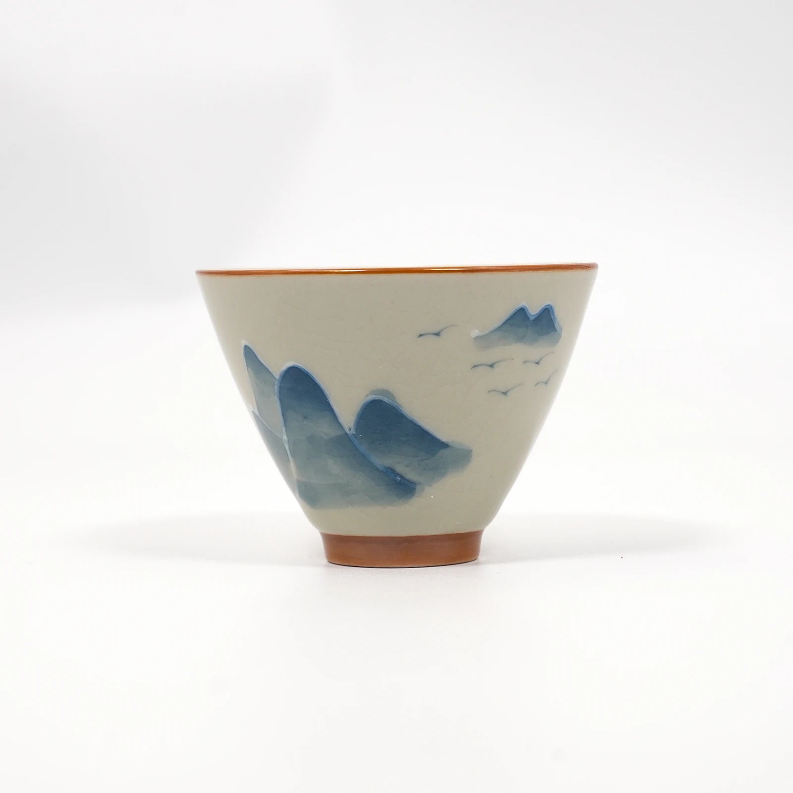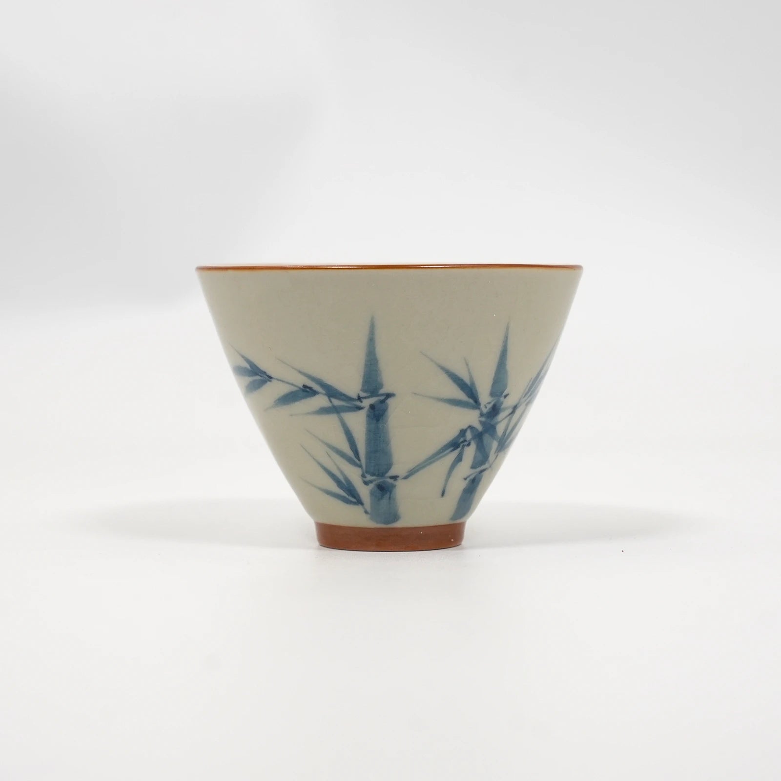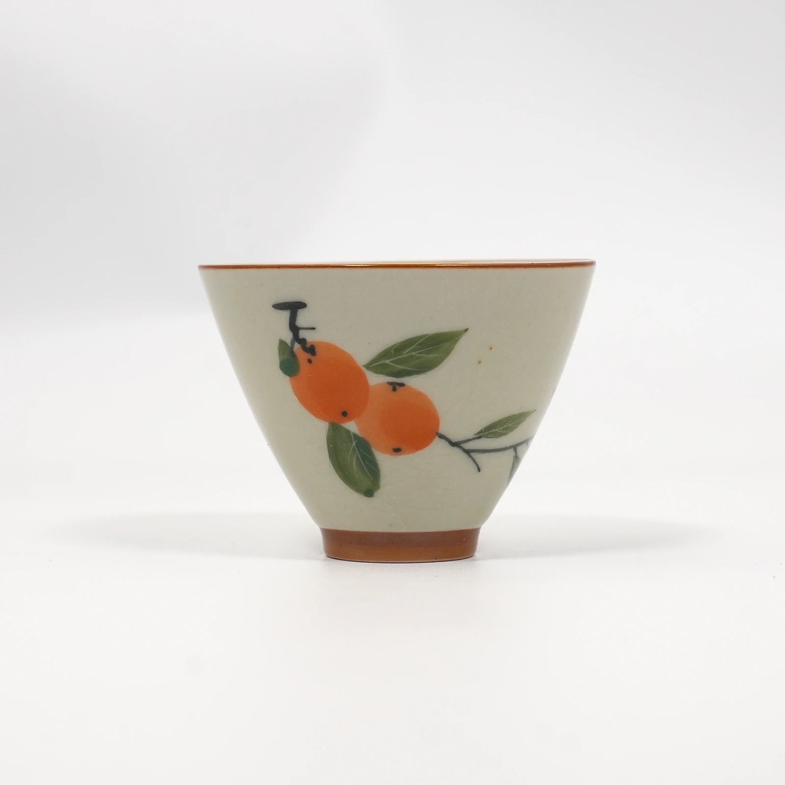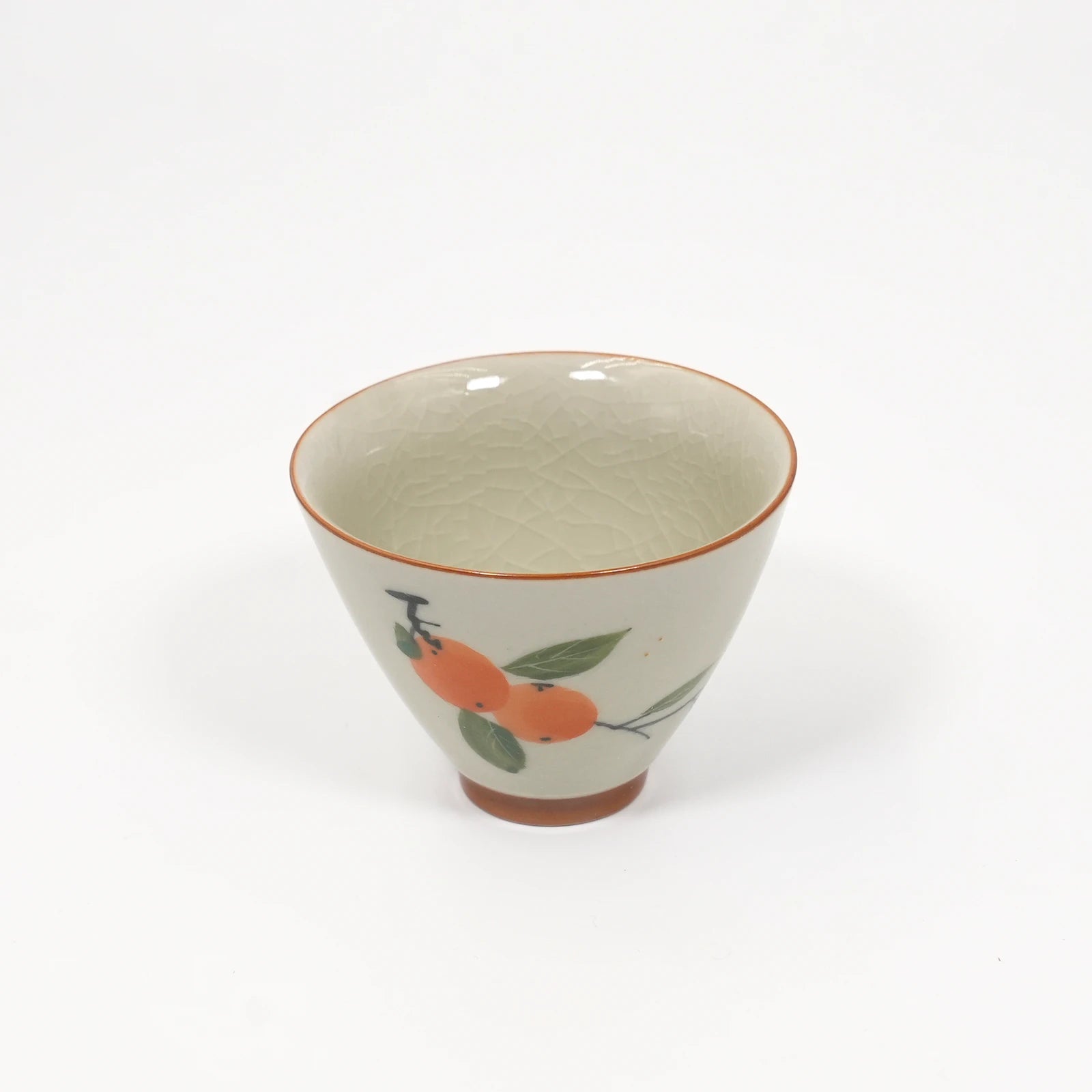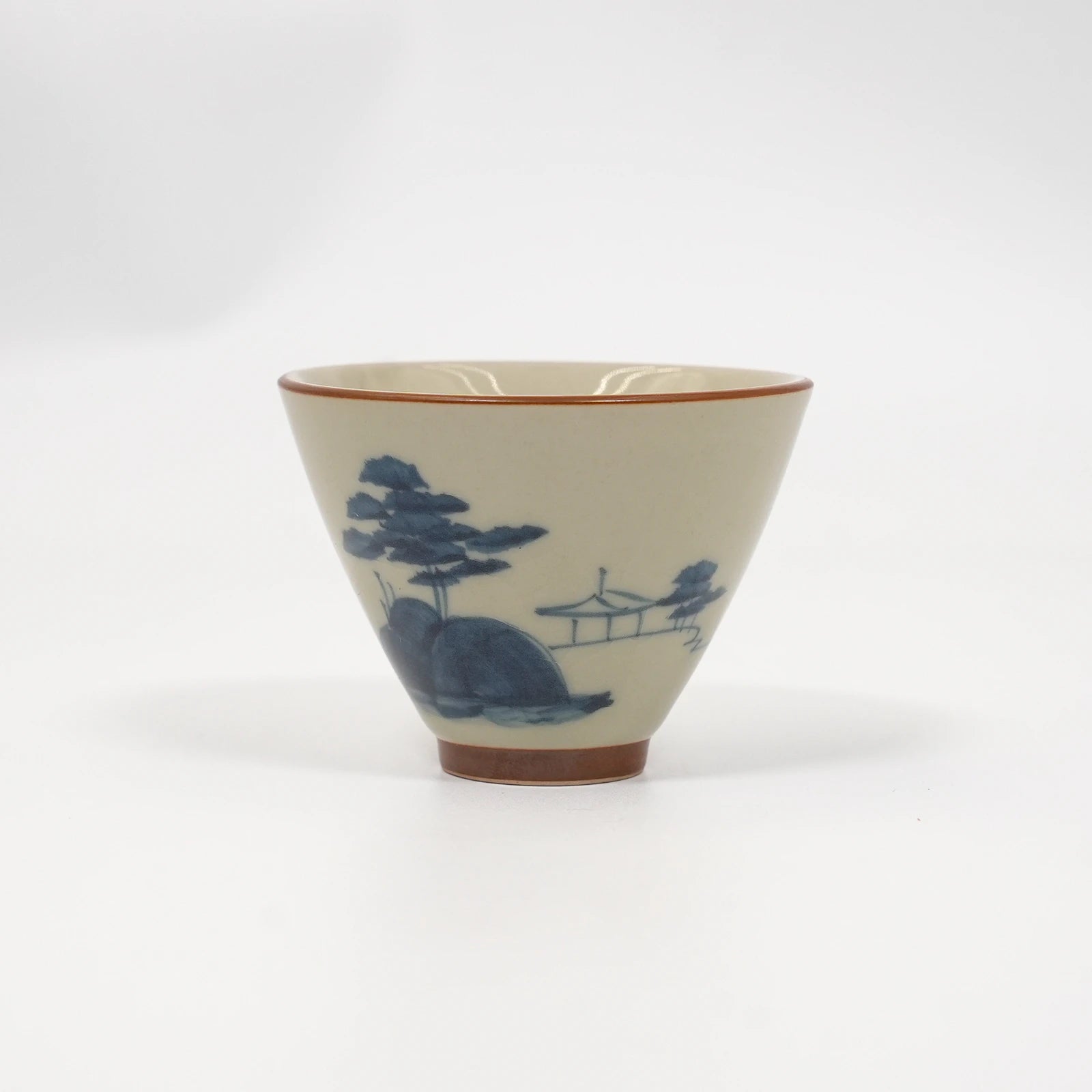 This set includes five cups made in Dehua, China. Each cup is hand-painted with a different motif: landscape, lotus, bamboo, mountain, and persimmon. The brushwork is smooth and expressive, bringing each design to life. All five cups use underglaze painting and feature the classic “douli” (conical hat) shape. They are fired at high temperatures, giving them a dense body and a smooth, delicate glaze that feels warm to the touch. The overall look is elegant and refined.