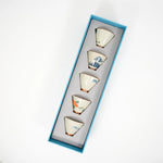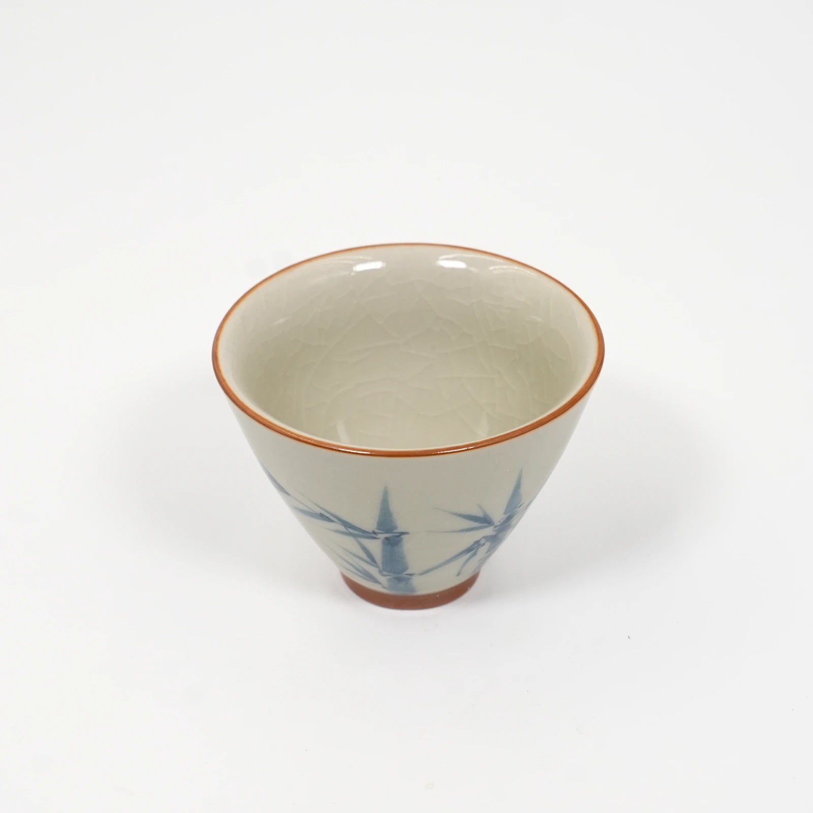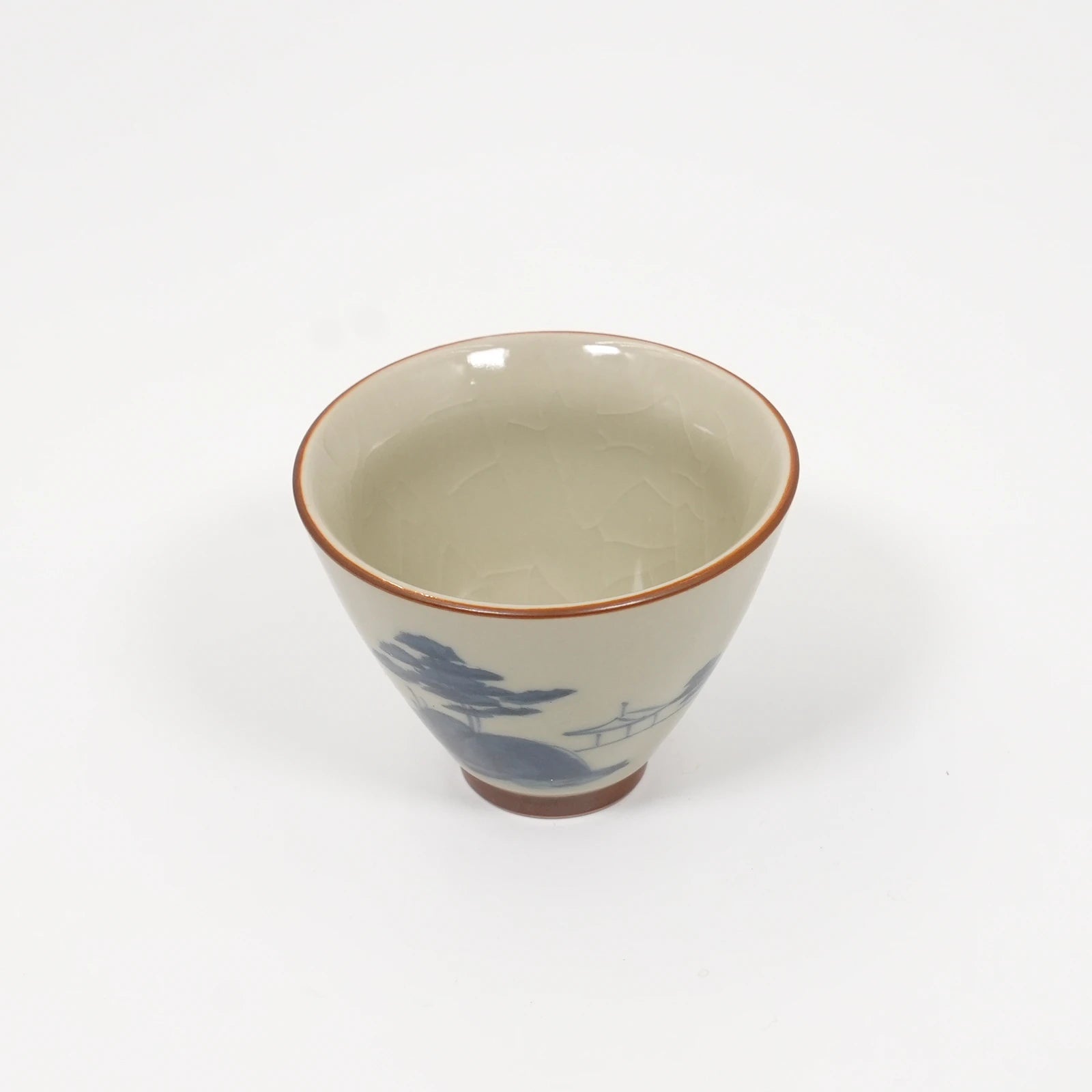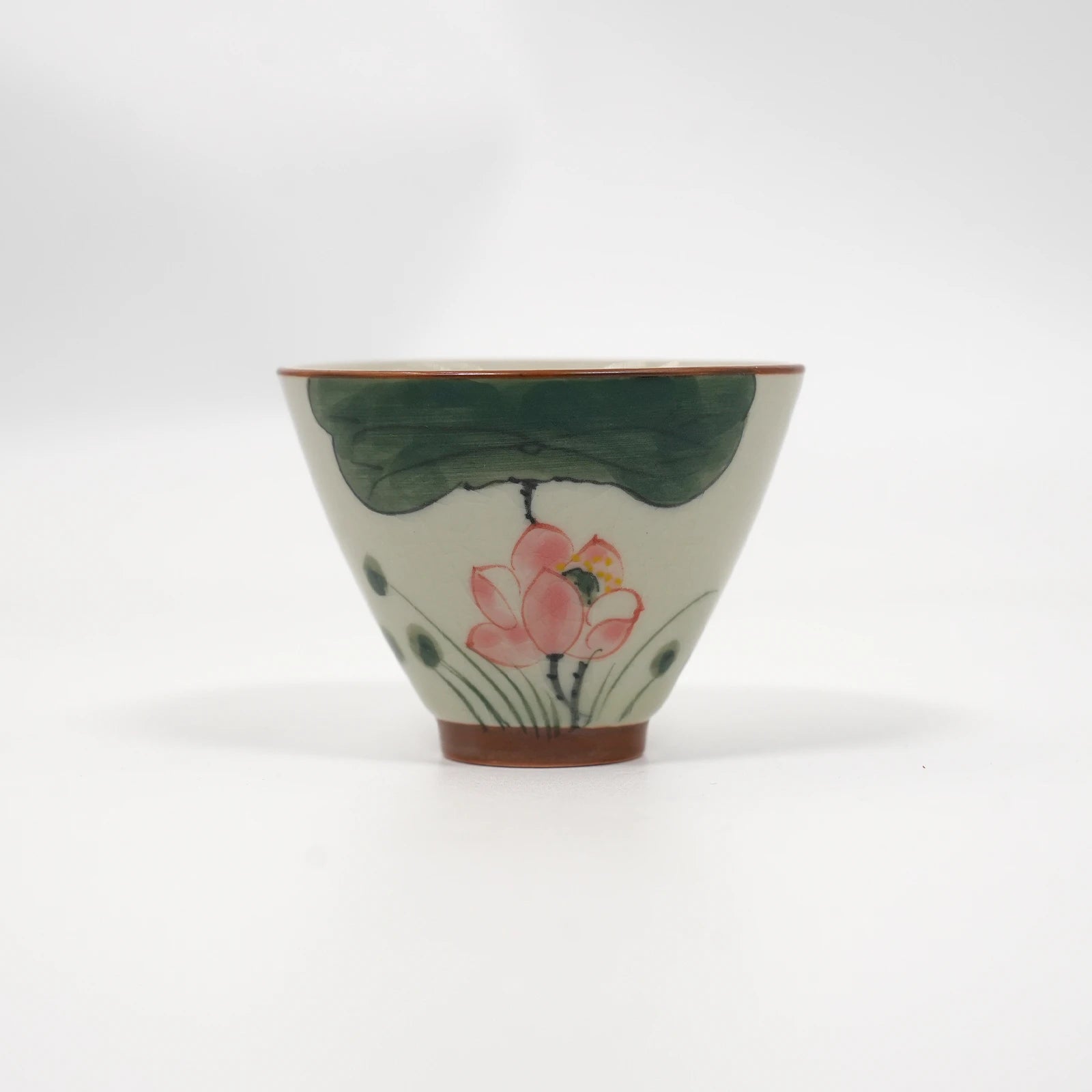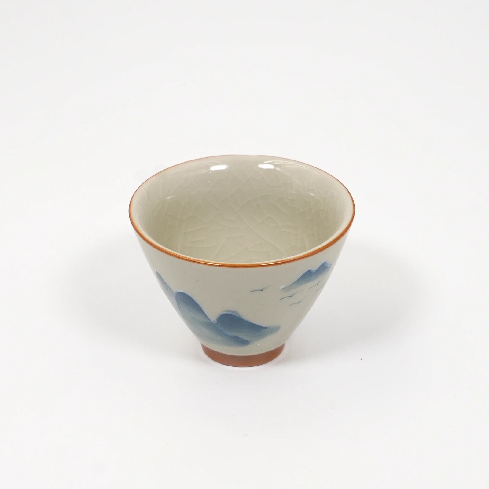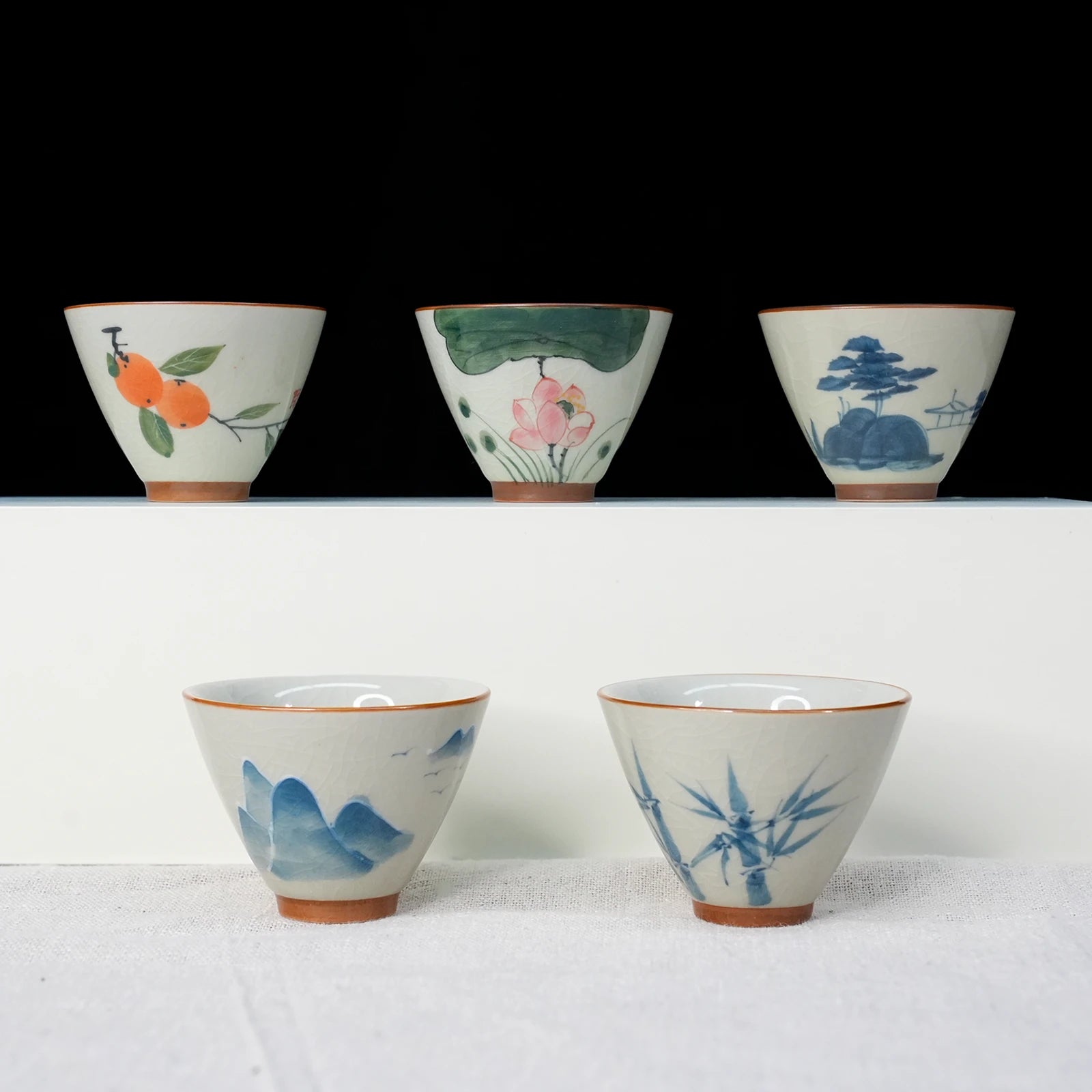 This set includes five cups made in Dehua, China. Each cup is hand-painted with a different motif: landscape, lotus, bamboo, mountain, and persimmon. The brushwork is smooth and expressive, bringing each design to life. All five cups use underglaze painting and feature the classic “douli” (conical hat) shape. They are fired at high temperatures, giving them a dense body and a smooth, delicate glaze that feels warm to the touch. The overall look is elegant and refined.