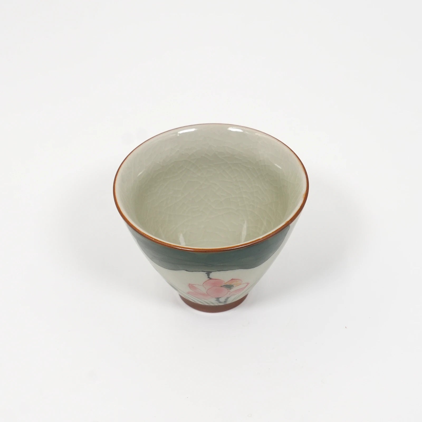 The glaze is a soft gray-green color. The rim is slightly thickened to enhance the drinking experience.